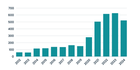 Figure 1: Number of wastewater epidemiology publications from 2011 to 2024, indicating a sharp rise during the COVID-19 pandemic.